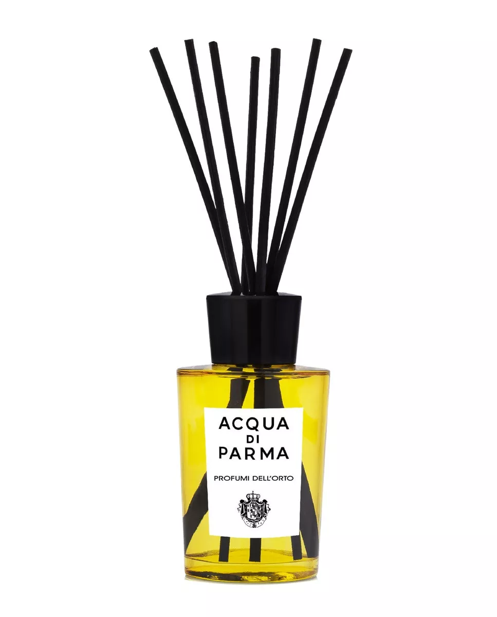 Acqua di Parma Difusor Profumi Dell'orto Home Collection 180 ml Acqua di Parma DescripciónInfunde un soplo del huerto italiano dentro de tu hogar, con los aromas típicos de la cocina italiana.La evocación de un momento preciso, lejos del ajetreo y el bullicio de la ciudad, durante un fin de semana en el campo. Una dulce escapada a un huerto bañado de luz y sublimado por la frescura de las hierbas aromáticas y las frescas hojas de tomate. Los aromas vegetales y placidos del campo se acentúan con bayas de pimienta, firmando una escapada que te ofrece serenidad y sensorialidad.Duración: 10-12 semanasNOTA: Todos los difusores vienen acompañados con varillas de ratán negro.