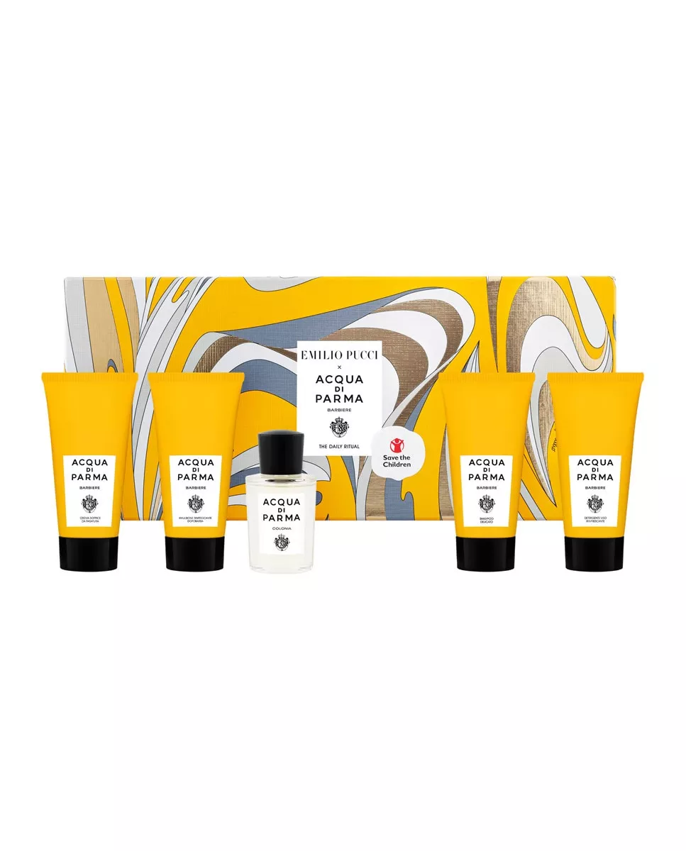 Acqua di Parma Estuche de regalo Eau de Cologne Barbiere the Daily Ritual Acqua di Parma DescripciónComposición del estuche:Eau de Cologne 20 ml + Barbiere Crema Afeitado Suave 40 ml + Barbiere Emulsión AfterShave Refrescante 40 ml + Barbiere Champú Suave 40 ml + Barbiere Limpiador Facial Refrescante 40 ml.Este año, la colección de navidad de Acqua di Parma brilla con el icónico estilo de Emilio Pucci y apoya la campaña "Riscriviamo il Futuro-Rewrite the Future" de Save the Children.Elegante y alegre, el estampado Vortici anuncia experiencias memorables incluídas en el set: una sofisticada selección del universo BARBIERE para recordar el verdadero ritual diario de afeitado italiano.Eau de Cologne: El Eau de Cologne Colonia por Acqua di Parma es atemporal, querida y duradera. Esta icónica fragancia creada desde las frutas cítricas de Sicilia es una elegante y fresca representación de las tradiciones italianas. Con un corazón cítrico floral desde la lavanda a la mezcla de rosas de damasco, el refinado olor de este Eau de Cologne se completa con notas amaderadas de vetiver, sándalo y pachulí en la base.Barbiere Crema Afeitado Suave: La crema de afeitado por Acqua di Parma se caracteriza por su fórmula hidratante y cremosa que suaviza la piel y levantando los bigotes para un excelente deslizamiento de cuchilla.Barbiere Emulsión AfterShave Refrescante: Prueba ahora la ligera Emulsión Aftershave de absorción rápida que combate los cortes de cuchilla. Formulado con ácido hialurónico que ayudan a restaurar la piel, la emulsión también aporta hidratación con su mezcla de aceites vegetales.Barbiere Champú Suave: El Champú Suave retira cuidadosamente la suciedad diaria a la vez que protege el pelo de la contaminación y dejarlo agradablemente perfumado.Barbiere Limpiador Facial Refrescante: Un limpiador de uso diario que retira cuidadosamente las impurezas y el exceso de grasa sin deshidratar la piel. Con el contacto del agua, su textura cremosa se transforma en una suave espuma. Después de su uso, los poros se tensan y la textura de la piel se suaviza para una sensación fresca, suave y flexible. EmpaquetadoEste set ha sido producido respetando el medio ambiente:FSC- papel certificadoInterior hecho con plástico recicladoCada producto en la colección contribuye a la campaña "Riscriviamo il Futuro-Rewrite the Future" de Save the Children.
