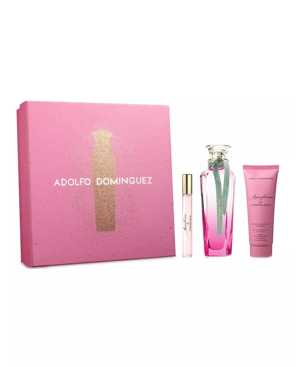 Adolfo Dominguez Estuche de regalo Eau de Toilette Agua Fresca de Gardenia Musk Adolfo Dominguez DescripciónComposición del estuche:Eau de Toilette vaporizador 120 ml + Loción Corporal 75 ml + Vaporizador bolso 10 ml.Aguas Frescas de Adolfo Dominguez entra en un nuevo territorio olfativo más sensual, con carácter y personalidad únicos. Aromas frescos y universales con toques sorprendentes para cautivar desde las primeras notas a la mujer joven y actual. Agua Fresca de Gardenia Musk. En el corazón, la naturalidad de las flores que nos muestra su esencia absolutamente femenina que con notas finales presenta la calidez de las maderas junto con el Musk que aportan una original personalidad.Familia Olfativa: Gardenia-Magnolia-Freesia.