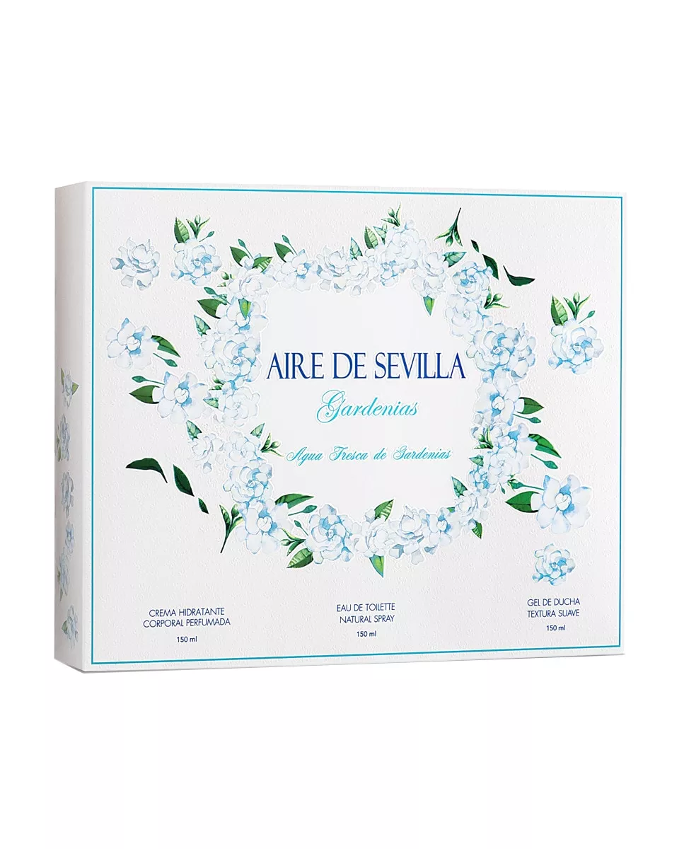 Aire de Sevilla Estuche de regalo Gardenias Aire de Sevilla DescripciónComposición del estuche:Eau de toilette natural spray 150 ml + Crema hidratante corporal perfumada 150 ml + Gel de ducha textura suave 150 mlNotas:FloralFloralAmaderadoAire de Sevilla Gardenias es un perfume suave y fresco, en el que predominan las notas florales cargadas de feminidad. Una fragancia equilibrada que refleja un carácter elegante, jovial y alegre.
