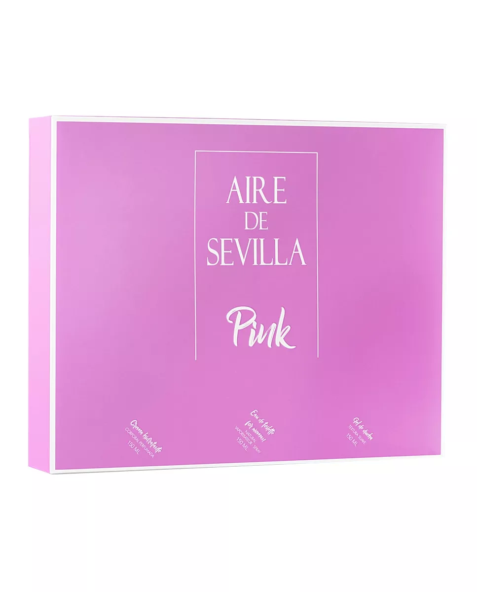 Aire de Sevilla Estuche de regalo Pink Aire de Sevilla DescripciónComposición del estuche:Eau de toilette for woman Pink Aire de Sevilla 150 ml + Gel de ducha textura suave 150 ml + Crema hidratante corporal perfumada 150 mlAire de Sevilla Pink, de salida floral-frutal, presenta una fresca combinación en la que predominan las notas cítricas y florales. El complemento ideal para una mujer divertida y creativa, de un carácter único y lleno de personalidad. Una explosión aromática que no pasará desapercibida.Notas:Afrutado - Floral