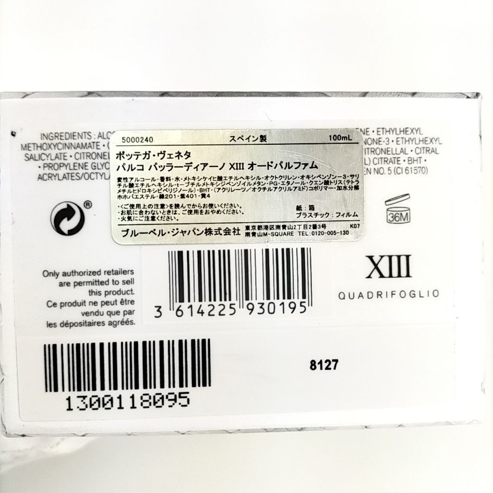 Bottega Veneta Eau de Parfum Parco Palladiano XIII Quadrifoglio 100 ml Bottega Veneta DescripciónParco Palladiano XIII - Quadrifoglio evoca a las hierbas aromáticas conquistando la brisa con su esencia. La composición final es sutil pero potente, con un trasfondo sensual.Discreción, calidad y una maestría sin igual: Bottega Veneta ha establecido un nuevo concepto de lujo. Parco Palladiano de Bottega Veneta es una colección exclusiva y absolutamente fastuosa compuesta por 15 fragancias inspiradas en un recorrido olfativo a través de un jardín palladiano en Italia.La colección Parco Palladiano se adentra hasta lo más profundo del corazón de Bottega Veneta y sus raíces en las tradiciones y la belleza de la región del Véneto. El Véneto es la cuna de algunos de los mejores artesanos del mundo, con técnicas que han ido pasando de generación en generación durante siglos. En esta región, los diseños atemporales de la mano del hombre conviven en perfecta armonía con la naturaleza que los rodea.Cada aroma de la colección Parco Palladiano es un «trompe l'oeil olfativo» que captura diferentes momentos y experiencias en un jardín palladiano. Parco Palladiano XIII - Quadrifoglio evoca a las hierbas aromáticas conquistando la brisa con su esencia. La composición final es sutil pero potente, con un trasfondo sensual. La frescura del rocío y una tersura natural, una brisa estimulante de cítricos y una textura vegetal de hojas aromáticas. Cada frasco de Parco Palladiano es un reflejo de las tradiciones de Bottega Veneta y de la región del Véneto, con el icónico intrecciato de la casa. El frasco se inspira en la tradición clásica del cristal veneciano, una estética que define la fragancia Bottega Veneta.