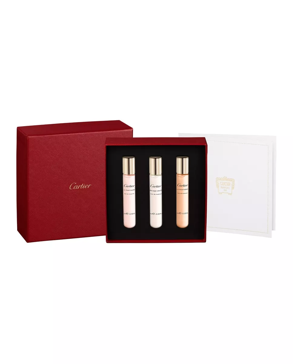 Cartier Estuche de regalo Eau de Parfum Estuche de descubrimiento 3 x 10 ml DescripciónUn estuche para descubrir los íconos femeninos de Cartier: Baiser Volé, La Panthère Eau de Parfum y La Panthère Eau de Toilette.