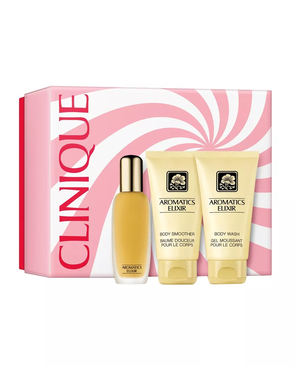 Clinique Estuche de Regalo Aromas Esenciales Aromatics Elixir Clinique DescripciónComposición del estuche:?Aromatics Elixir? Loción corporal, 75 ml?Aromatics Elixir? Gel de Ducha, 75 ml?Aromatics Elixir? Perfume en Spray, 45 mlNuestra máscara de pestañas más vendida y un desmaquillador que retira fácilmente el maquillaje, sin irritación. Listo para regalar.Esta fragrancia, para las que no se conforman, es mucho más que un perfume. Cautiva los sentidos y actúa en la mente y el espíritu. Aromatics Elixir invoca el individualismo de cada mujer. Combínalo con la Loción Corporal y el Gel de Ducha para conseguir unas notas más duraderas de rosa, jazmín, ylang ylang y vetiver. Aromas esenciales en una caja de regalo.Nuestra filosofía Clinique.Fácil. Seguro. Efectivo. Sometido a pruebas de alergia. 100% sin perfume.