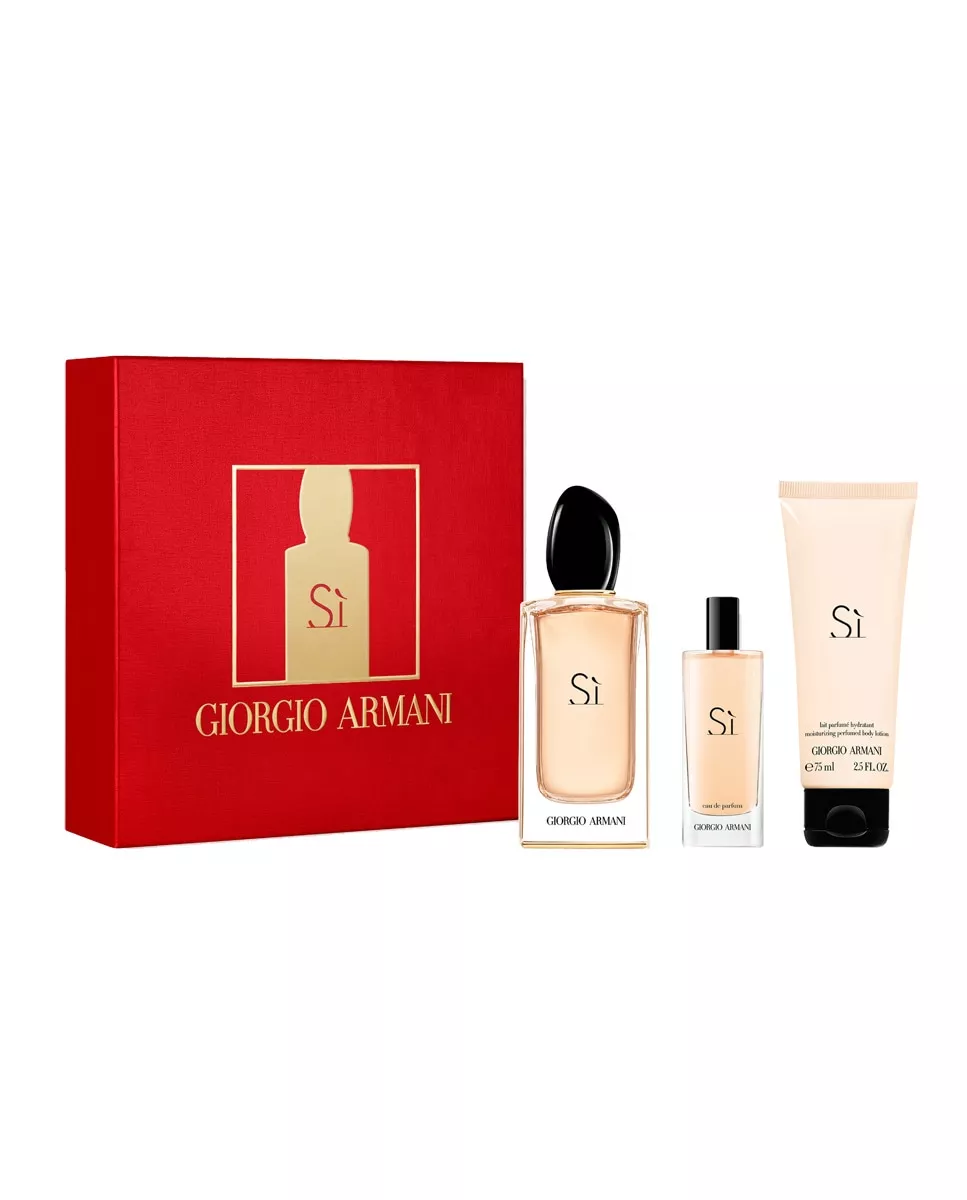Giorgio Armani Estuche de regalo Eau de Parfum Sí Giorgio Armani DescripciónComposición del estuche:Eau de Parfum vaporizador 100 ml+ Vial 15 ml + Loción de cuerpo 75 ml.Descubre nuestra selección de productos con el cofre perfecto para estas Navidades. El perfume SÌ es un perfume con notas en chipre afrutado, perfecto para mujeres con actitud y fuerza. Sì es la fragancia femenina que permite que cada mujer afirme quien es con la libertad de ser ella misma, exprese sus auténticas pasiones y emociones reivindicando su lugar en el mundo moderno. Ideal para mujeres con fuerza que se atreven a decir Sì. ¿Es tu madre una de ellas? La fragancia para mujer Sì combina tres notas: néctar de grosella negra, moderno chipre y almizcle de madera rubia con toques de freesia y aroma de rosa de mayo. Este nuevo perfume ha sido concebido para la mujer moderna, fuerte pero femenina, sofisticada pero carismática. Encarna la exquisita esencia de la elegancia y el estilo italiano.Sì el tributo a la nueva feminidad.Nota principal: ChipreModo de aplicaciónAplique su fragancia en el interior de las muñecas y detrás del lóbulo de las orejas. Estas zonas de pulso tienen una temperatura superior al resto del cuerpo, y esto ayudará a que la fragancia se evapore más lentamente. Aplique su body lotion dos veces al día, masajeando suavemente por todo el cuerpo hasta que la loción sea absorbida por la piel.