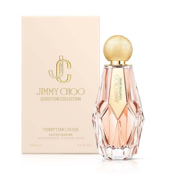 Jimmy Choo Eau de Parfum Seduction Collection Tempting Rose 125 ml Jimmy Choo DescripciónTempting Rose es una fragancia floral suave, delicada, brillante y natural. Un aroma a rosa fresca, delicada pero sensual, que realza la belleza natural. Una fragancia floral con notas frutales en el corazón, y un ligero fondo amaderado. A las fragancias de la colección les acompaña un espectacular frasco joya en color dorado.Notas Olfativas: Rosa, Almizcle blanco, Frambuesa, Lychee, Pera, Madera de Cedro y Madera de Sádalo.Nota principal:Floral