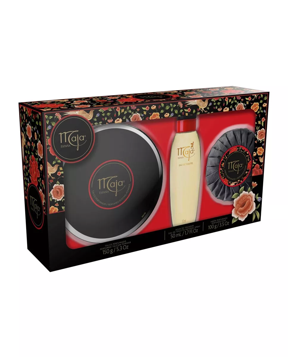 Maja Estuche de regalo Talquera Maja DescripciónComposición del estuche:Talquera 150 g + Jabón 100 g + Eau de Toilette 50 mlMaja Clásica: la esencia de España. Elaborados con aceites esenciales, extraídos directamente de las flores más bellas, brindan una sensación relajante y sensual durante el día manteniendo la piel perfumada con un delicioso aroma. Presentado en una bonita caja de cartón con motivos inspirados en el tradicional mantón de Manila. Ideal para regalo.