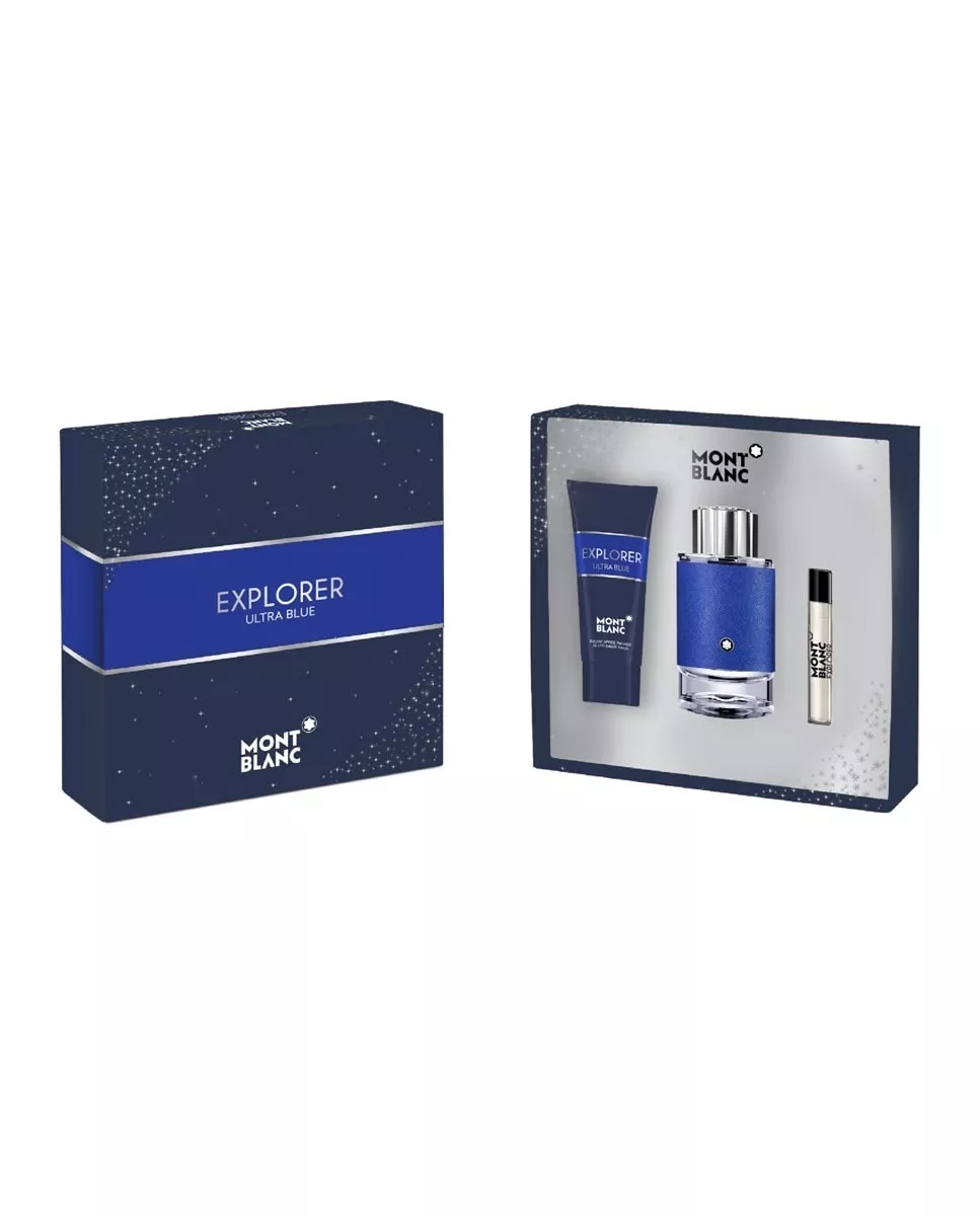 Montblanc Estuche de regalo Eau de Parfum Montblanc Explorer Ultra Blue Montblanc DescripciónComposición del estuche:Eau de parfum vaporizador 100 ml + Gel de ducha 100 ml + Vial 7,5 ml.Montblanc Explorer Ultra Blue es un aroma original que despierta el deseo de descubrir la paleta de azules de la Naturaleza: cielo, mares y montañas cubiertas de hielo.Un aroma cítrico marino amaderado con luminosas notas de salida de bergamota italiana y cítricos de la mejor calidad. El acorde marino es el corazón palpitante de la fragancia. La profundidad acuática y azul que se obtiene de la fusión de notas cítricas con notas marinas y aéreas evoca el frescor de los paisajes alpinos. Las notas de fondo definen la estructura de Explorer Ultra Blue: un singular pachulí de la mejor calidad elaborado en exclusiva para Montblanc se combina con maderas refinadas para crear un fondo terroso y rico con facetas de cuero.Sello de excelencia en diseño y calidad, la gruesa base de vidrio del frasco revela la icónica estrella Montblanc, que representa las seis laderas glaciales del pico nevado de la montaña epónima.Ensamblada a mano en la Pelleteria de la Maison en Florencia, la funda protectora de imitación de cuero lleva impreso el elegante motivo Saffiano Ultra Blue y está decorada con el emblema Montblanc manufacturado en la fábrica que la Maison tiene en Hamburgo.Nota principal:Fragancia cítrica marina amaderada