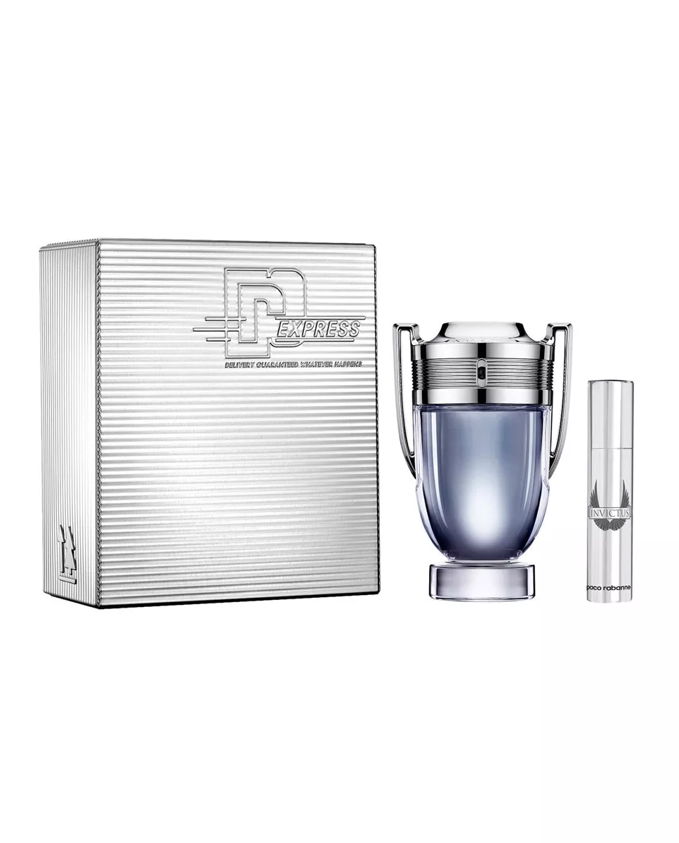 Paco Rabanne Estuche de regalo Eau de Toilette Invictus Paco Rabanne DescripciónComposición del estuche:Eau de Toilette vaporizador 150 ml + Miniatura 10 ml.Un éxtasis, un preludio fresco, vibrante, vivificante. Dos fuerzas inesperadas actuan juntas: éxtasis y adicción; una oposición de universos, de fuerzas, de sensaciones y de valores. Invictus es un amaderado fresco donde lo picante responde a lo vigoroso.Un estremecimiento de frescor y una sensualidad viril . El sueño de ser victorioso, icono para los hombres, fantasía de las mujeres.Notas:Salida: Dos fuerzas inesperadas: frescor y sensualidad.Corazón: Frescor: Piel de Pomelo, Hoja de Laurel y Acorde Marino.Fondo: Sensualidad: Ámbar Gris, Pachulí y Madera de Guaïac.Nota principal: Amaderado Fresca.