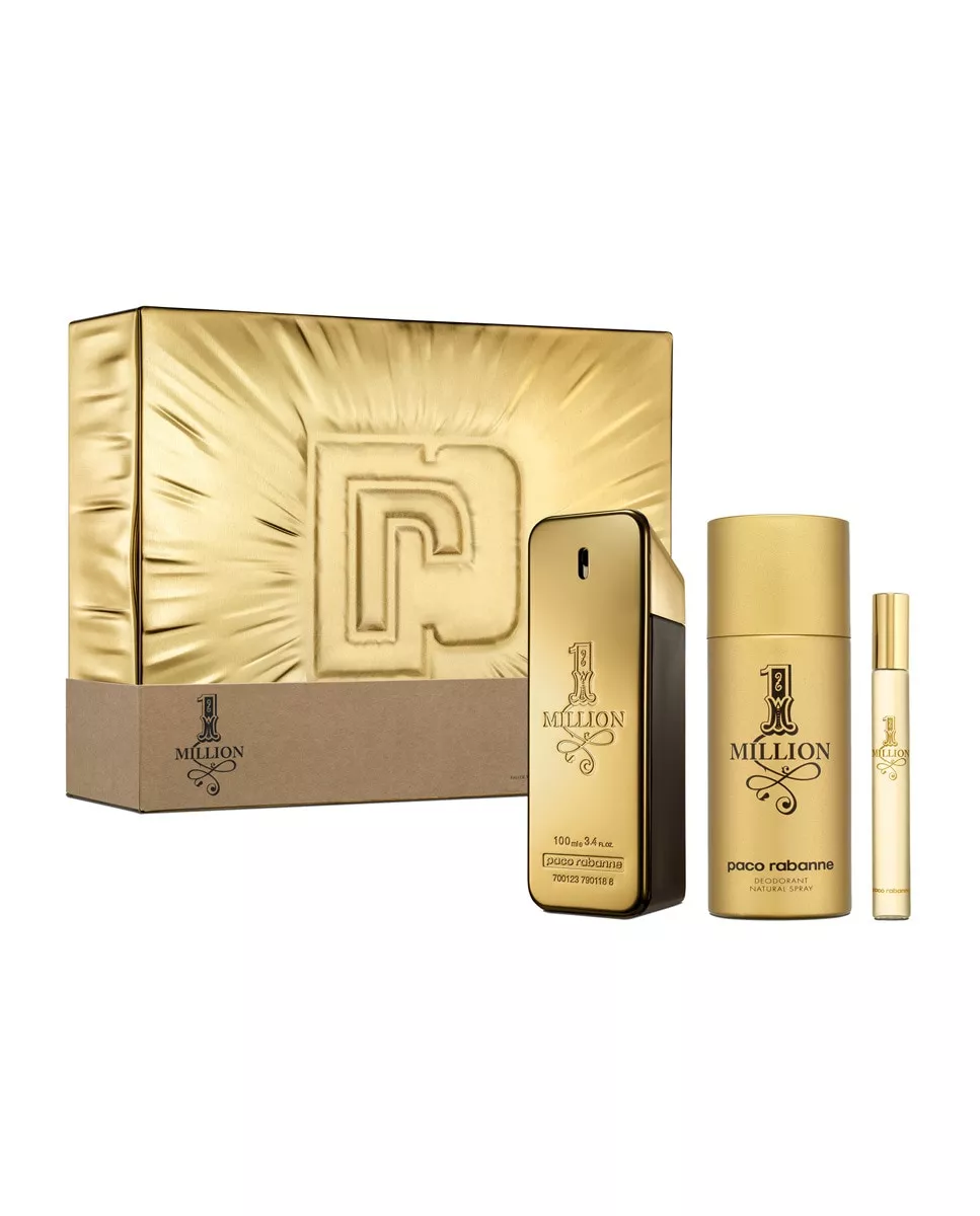Paco Rabanne Estuche de regalo Eau de Toilette One Million Paco Rabanne DescripciónComposición del estuche:Eau de Toilette vaporizador 100 ml + Desodorante 150 ml + Travel spray 10 ml.Humor, sensualidad, estilo gentleman. Paco Rabanne apuesta 1 millón al gran retorno de la seducción masculina.El oro, materia predilecta de Paco Rabanne, reaparece aquí en un frasco asombroso en forma de lingote de oro, numerado y labrado. Dandy con pinta de rufián, el modelo Matt Gordon es el icono de 1 Million.Difícil de catalogar, 1 Million es un perfume singular donde se combinan notas frescas, efluvios aromáticos y especiados, sensación de fruta jugosa, pero también notas de flores, de maderas cálidas y una impronta de cuero suave.Familia Olfativa: Amaderada, EspeciadaNotas de salida: Mandarina Sanguínea, Pomelo y Menta pimentada.Notas de Corazón: Absoluto de rosa, Canela y Especias.Notas de Fondo: Cuero rubio, Pachulí, Maderas blancas y Ámbar.Nota principal:Amaderada
