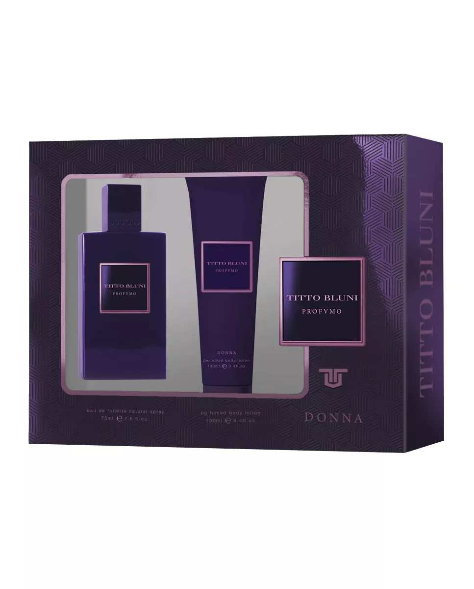 Titto Bluni Estuche de regalo Eau de Toilette Profumo Donna Titto Bluni DescripciónComposición del estuche:Eau de toilette 75 ml + Body Lotion 100 mlLa mujer Titto Bluni es sensual y elegante. Profumo Donna tiene notas de salida cítricas y ligeramente picantes, con toques de Bergamota, pimienta rosa, ruibarbo y grosellas, que dejan paso a un corazón floral de rosa y melocotón para un fondo elegante ysensual de pachuli y almizcle.